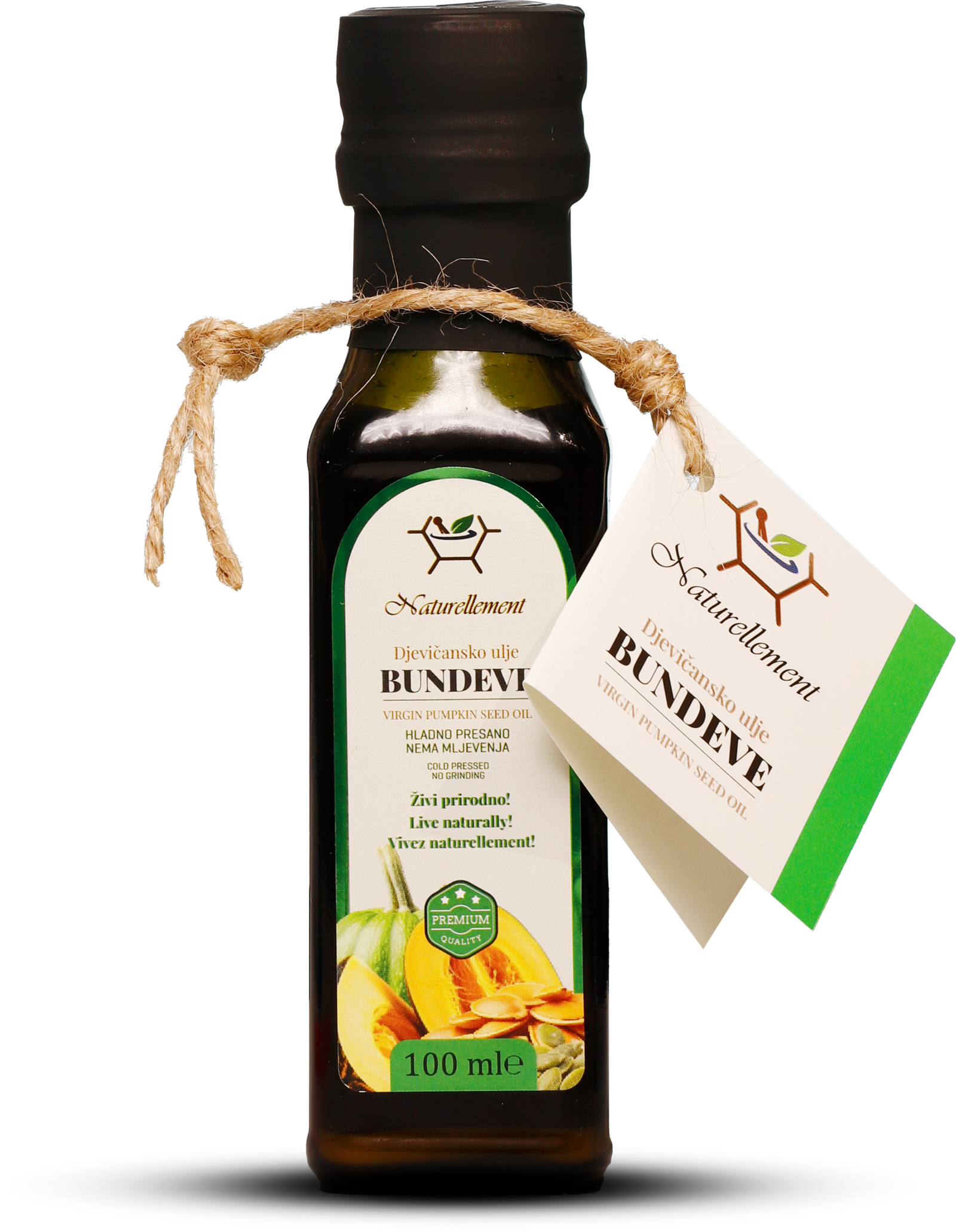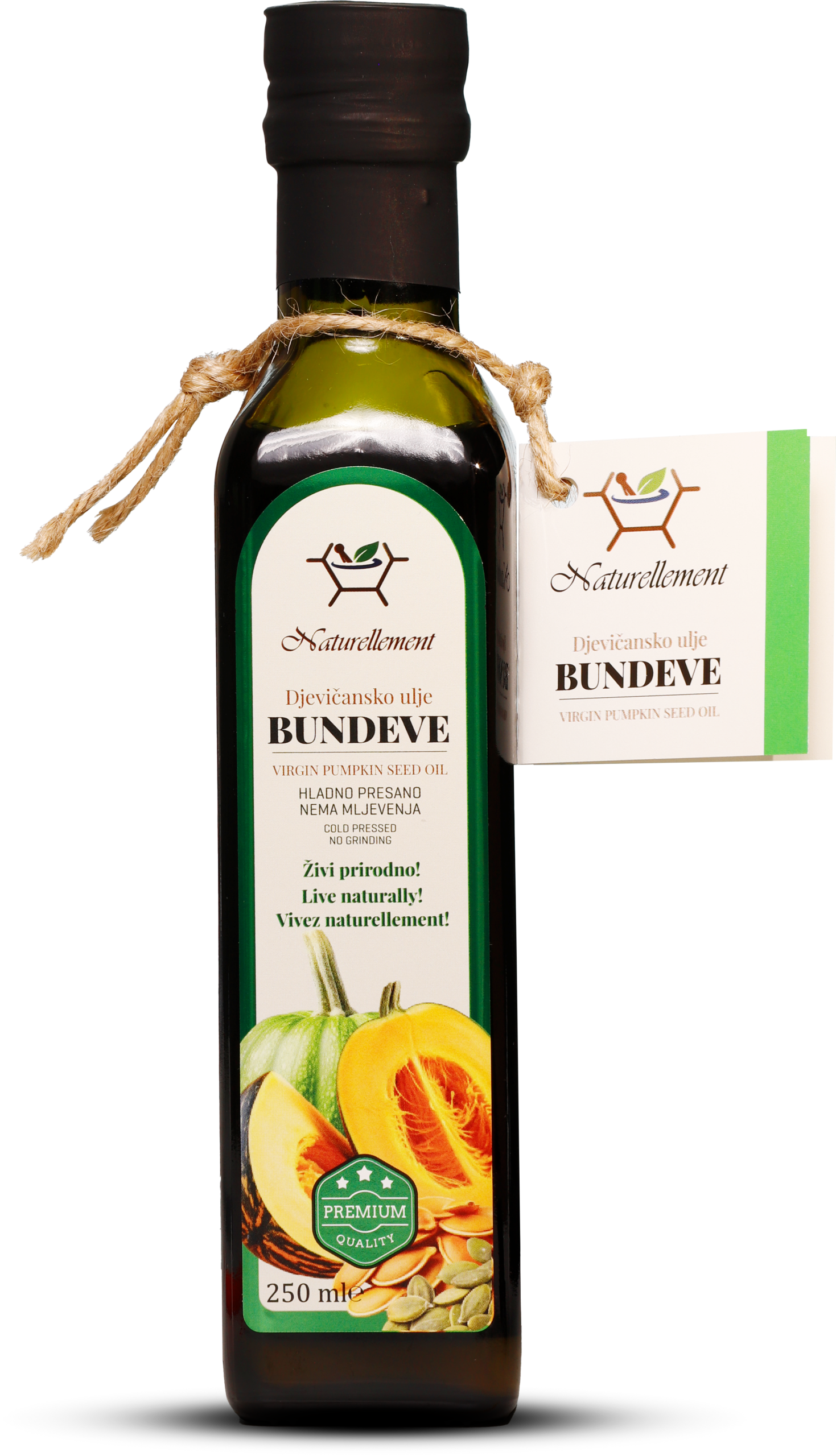 🌿 Ulje je dobijeno isključivo mehaničkim putem od svježih sjemenki bez upotrebe topline, hemijskih otapala ili drugih dodataka. Stoga je nešto svjetlije, zelenkasto-crvene boje, vrlo nježnog mirisa i okusa sličnog sirovim sjemenkama bundeve. Sadrži visok udio nezasićenih masnih kiselina (ALA Omega-3). Unos djevičanskog ulja bundeve na dnevnoj bazi preporučuje se u iznosu od jedne kašike (15 ml) po 50 kg tjelesne težine.